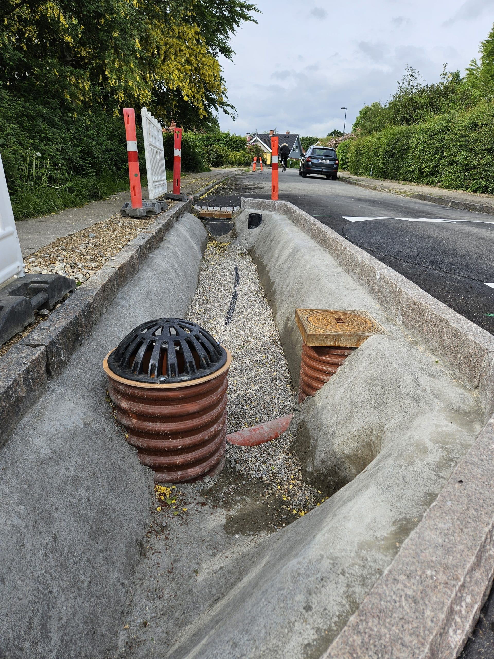 Arbejdet er gennemført etapevis med delafleveringer, hvilket har muliggjort løbende kvalitetssikring og minimeret gener for beboerne. Der har været fokus på tydelig varsling, sikker adgang og hensyntagen til områdets daglige brug. Projektet omfatter etablering af 33 grønne vejbede fordelt på foreningens interne veje samt ét større regnbed i et grønt fællesareal. Regnvand fra vejarealerne afkobles og ledes til bedene via fordelingsrender og indløb, hvor vandet nedsives gennem filterjord og videre til underliggende faskiner.