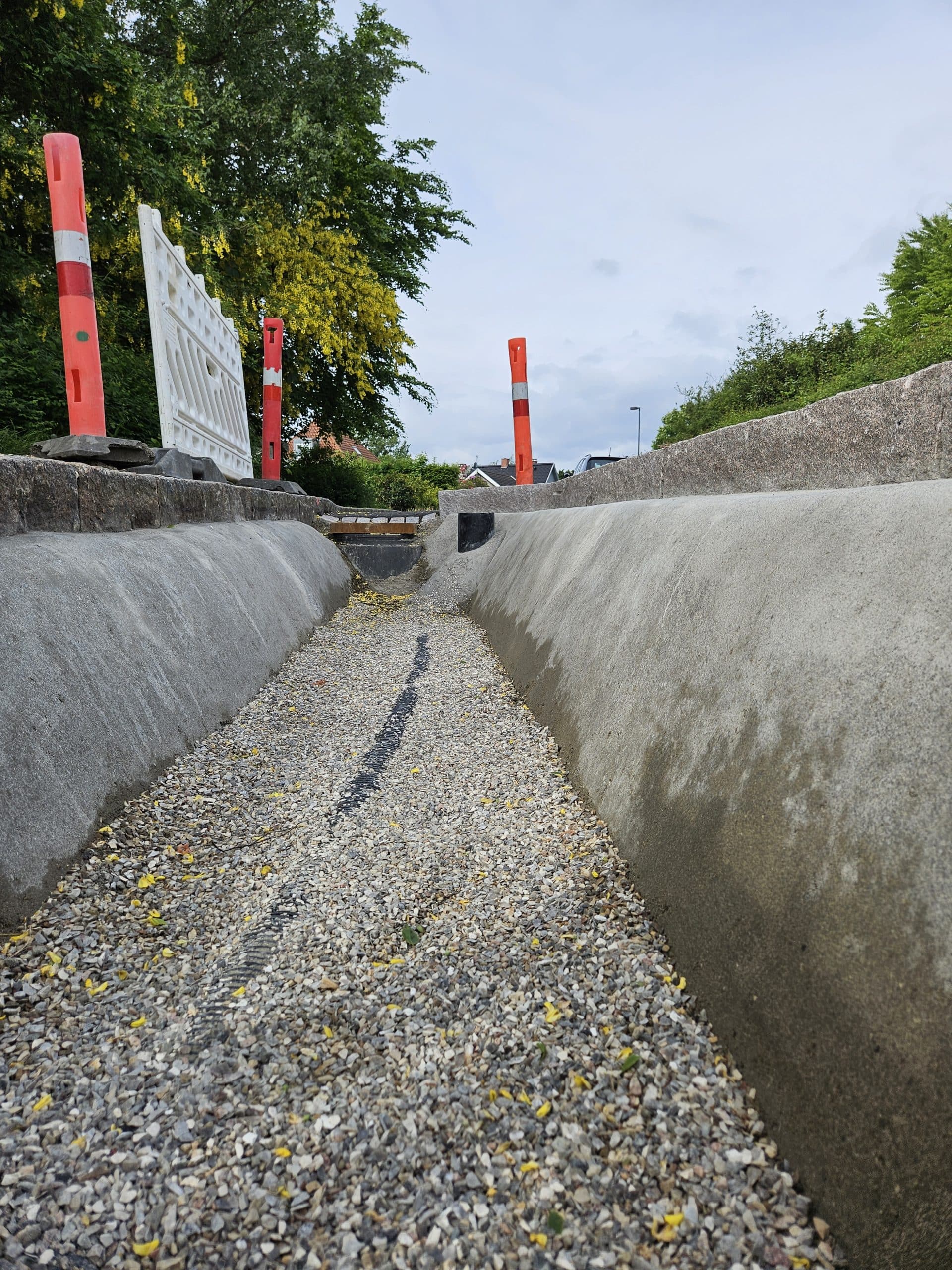 Ved større regnhændelser sikres kontrolleret afledning via overløb til det eksisterende kloaksystem. Løsningen er dimensioneret og udført med præcise koter og faldforhold for at sikre korrekt hydraulisk funktion.